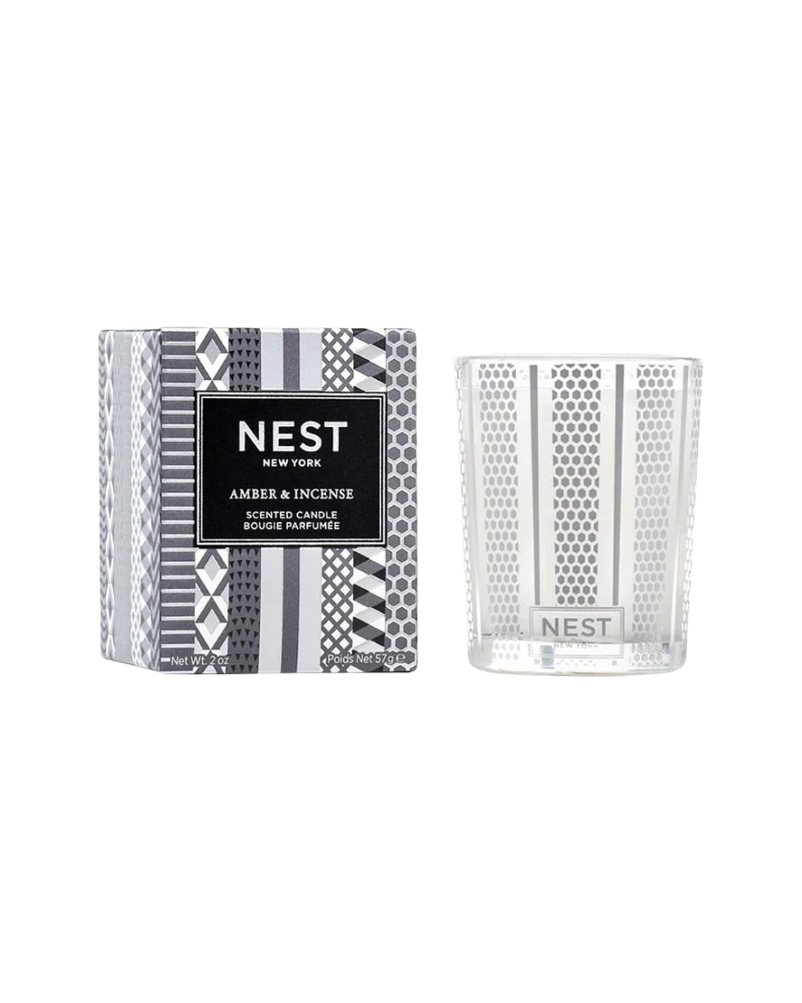 This Votive Candle offers an exotic take on ancient traditions with rich notes of crisp black amber, frankincense, and aromatic cedar.
