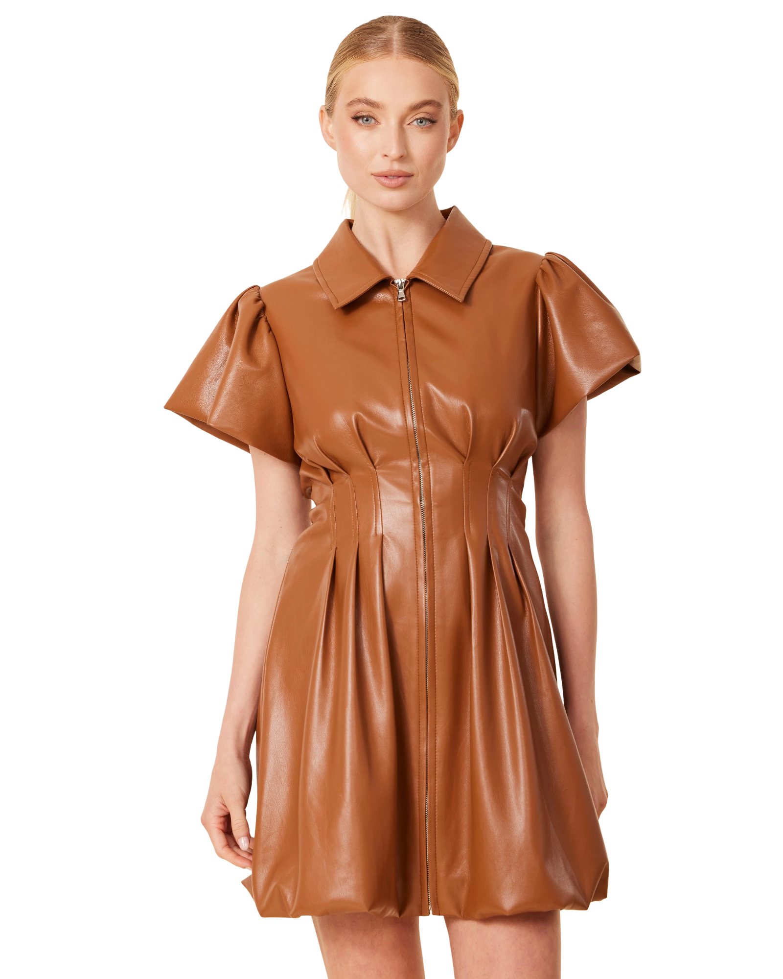 Refresh your Fall wardrobe with our faux leather bubble dress, featuring structured puff sleeves, a flattering pleated design, and a sleek front zip closure.