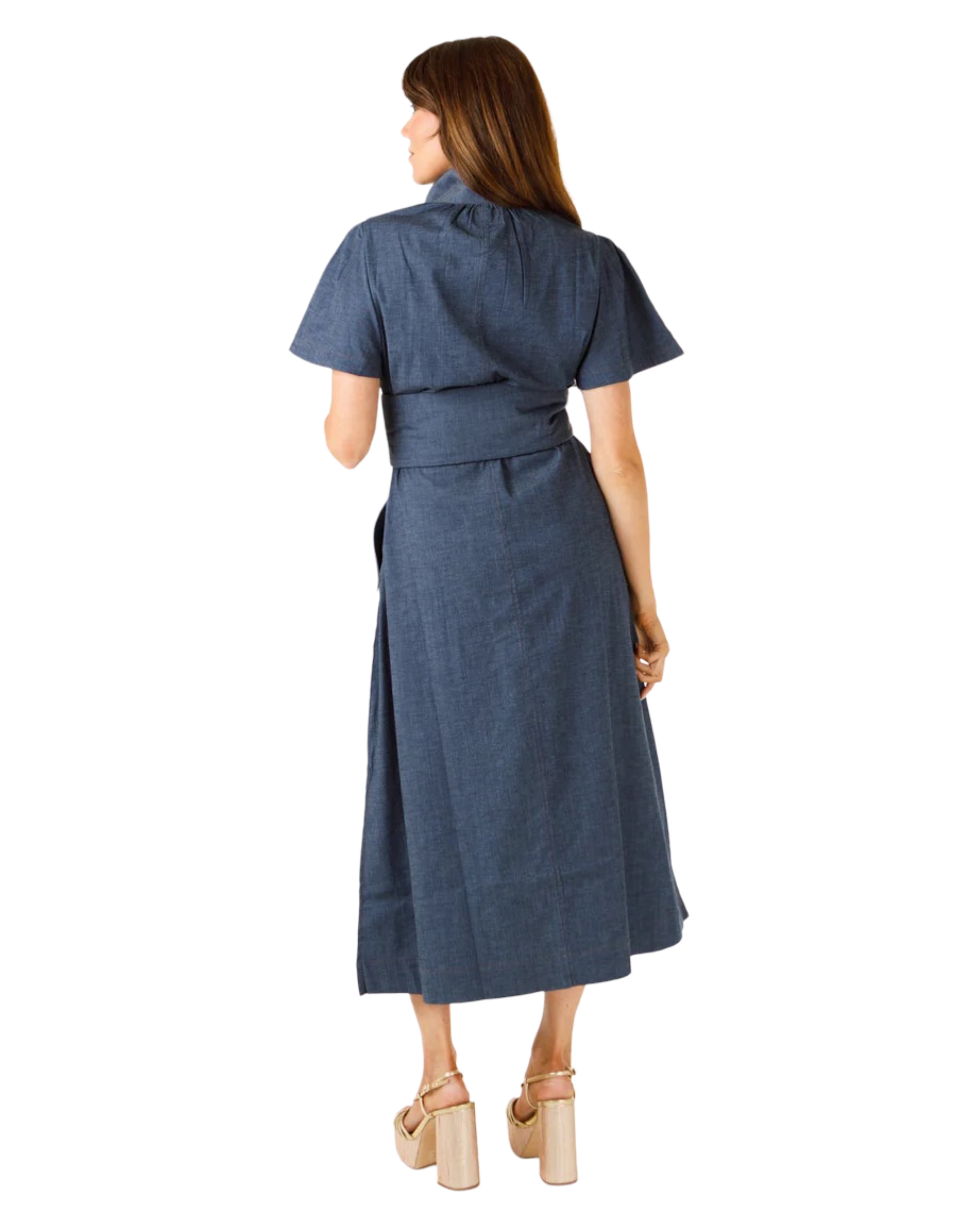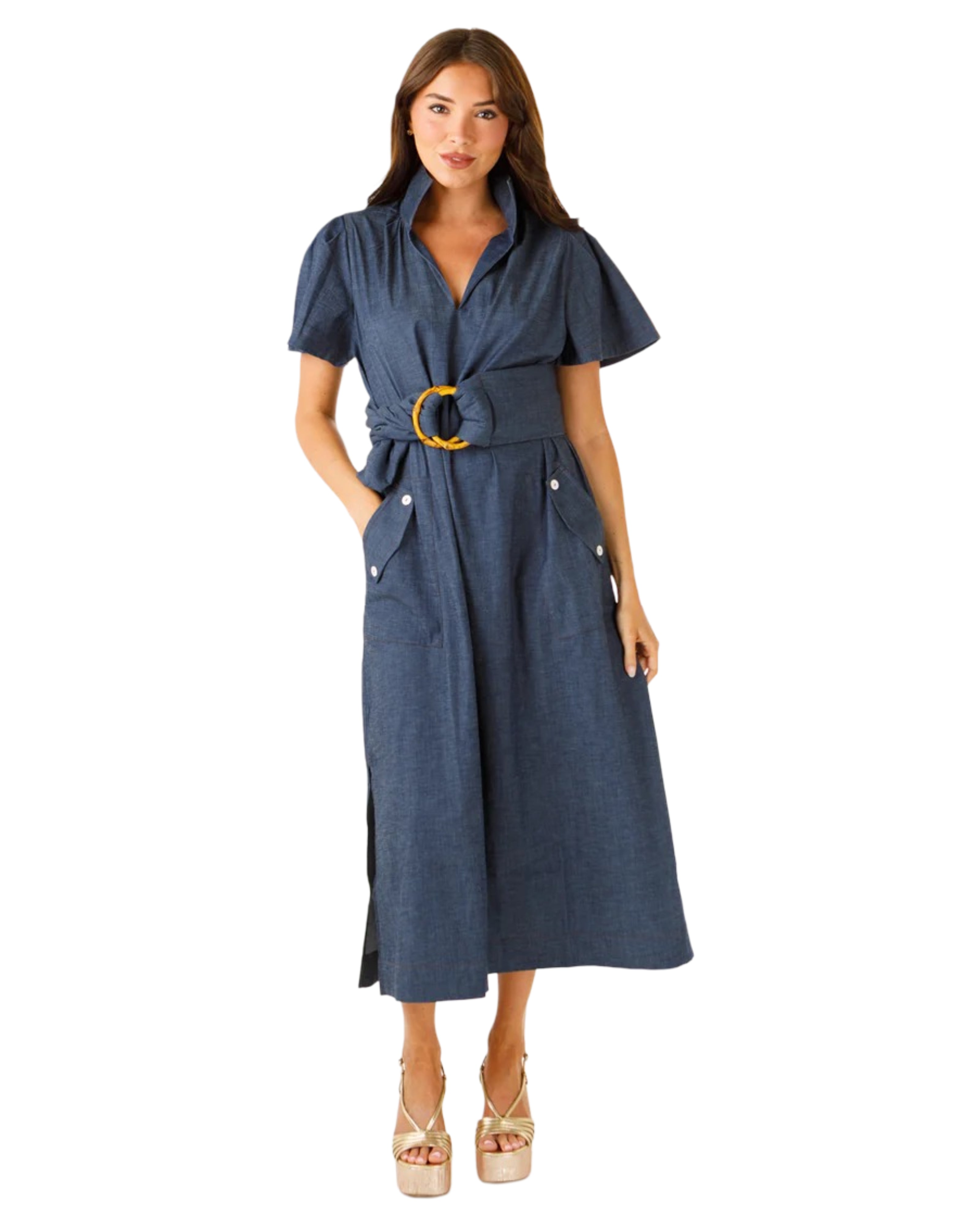 Signature stand collar, stretch denim fabric, front button pockets, softly pleated sleeves and stunning side slits.