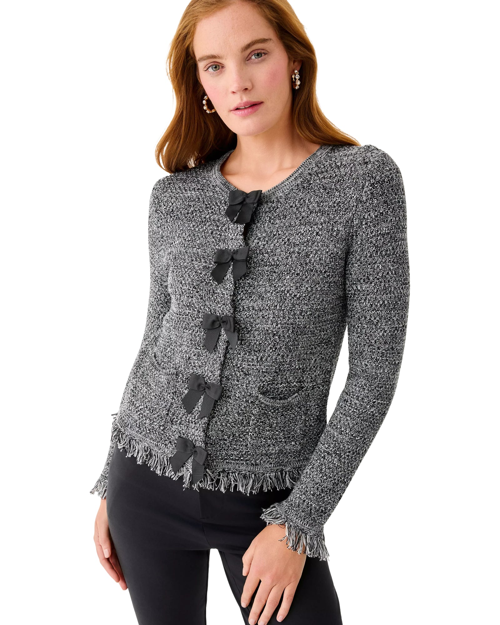• Long sleeve, crew neck cardigan with a fringe trim and bows.
