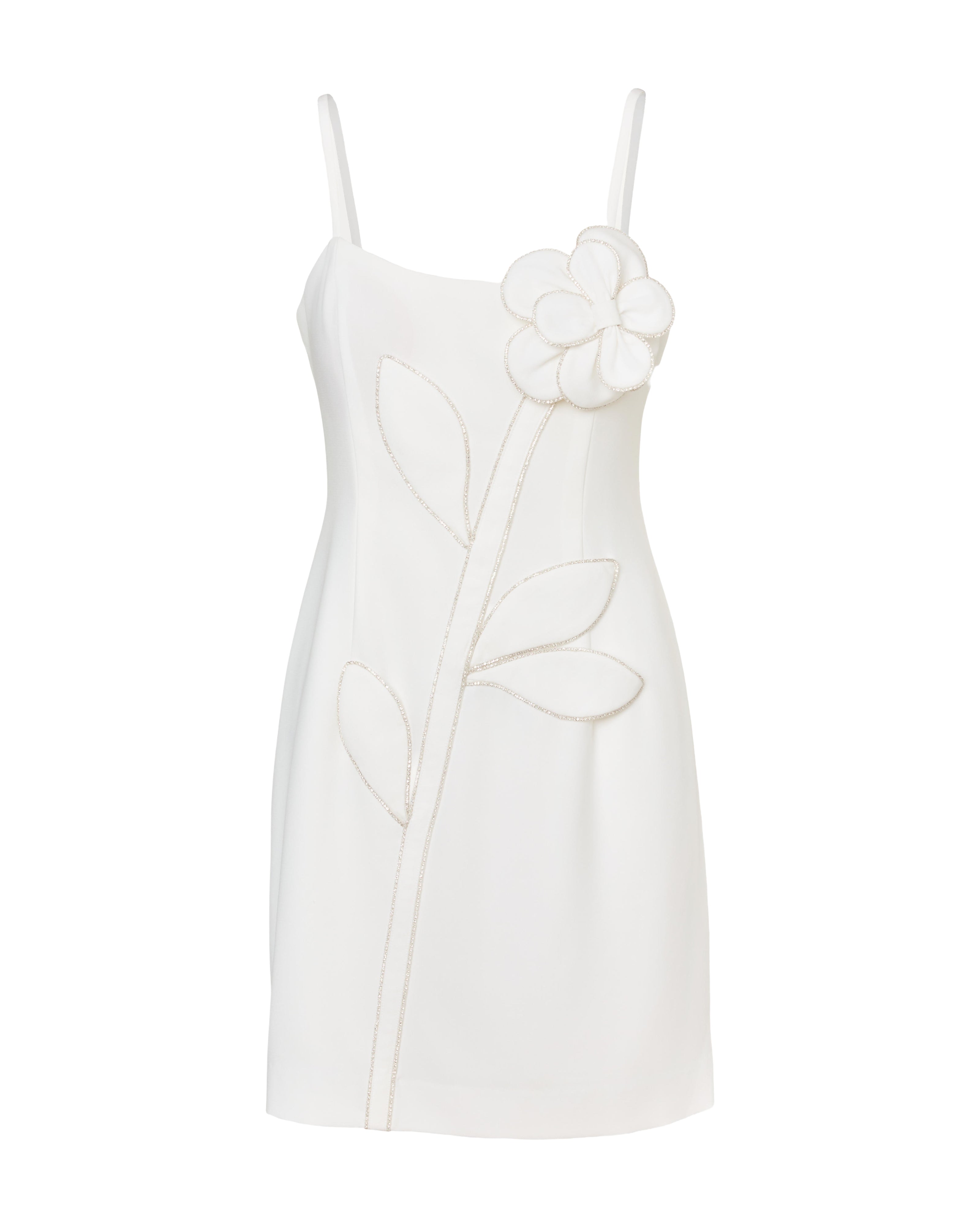 • Fitted dress with adjustable spaghetti straps and a floral applique with rhinestones.