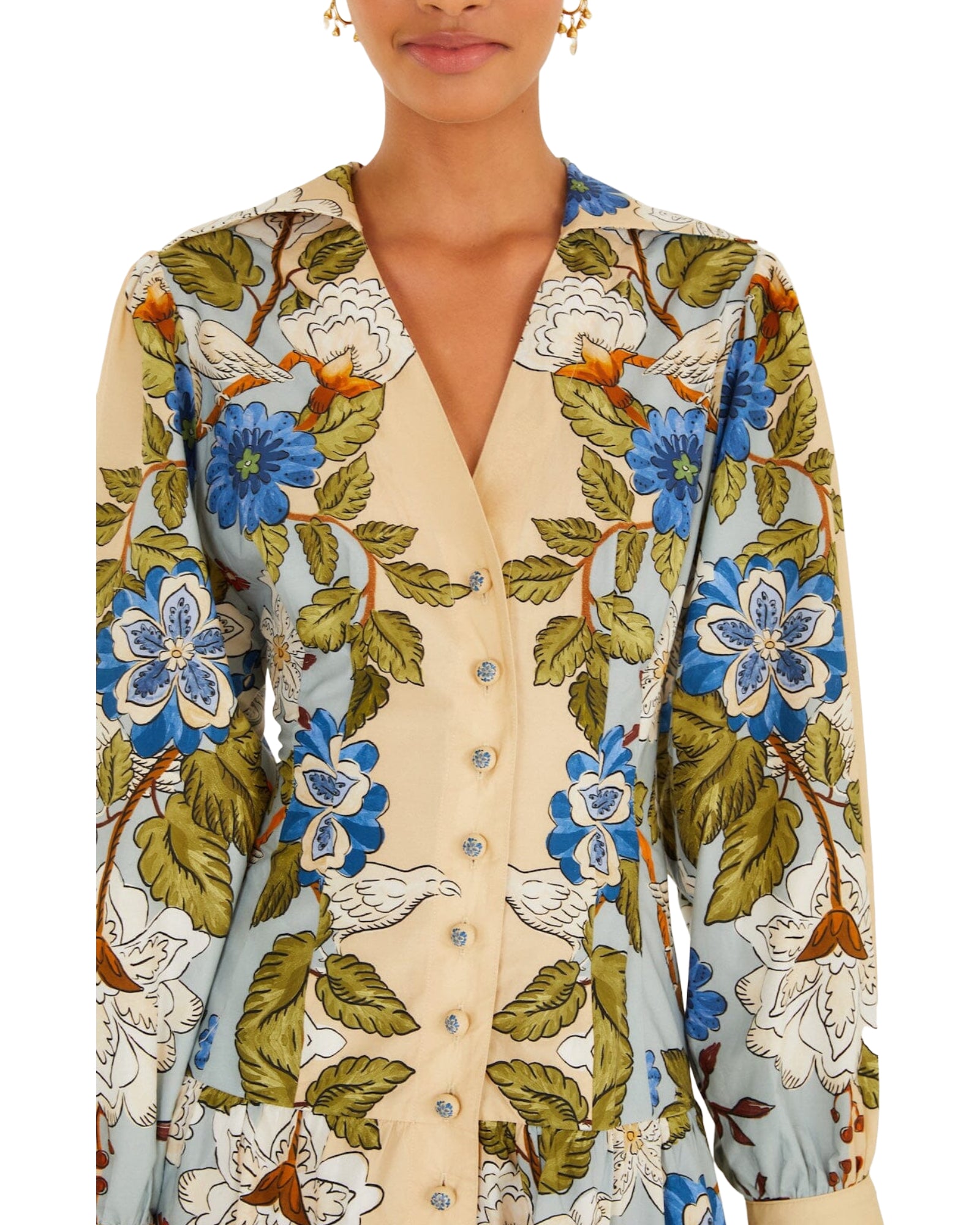 Crafted from soft organic cotton, this dress features a delicate collar neckline and a playful midi silhouette that flows with gentle ease. Its warm, earthy tones are adorned with subtle scarf-inspired prints, blending nature’s beauty with Brazilian vibrancy. The long sleeves and breathable fabric make it a cozy, graceful choice for any sunlit day.