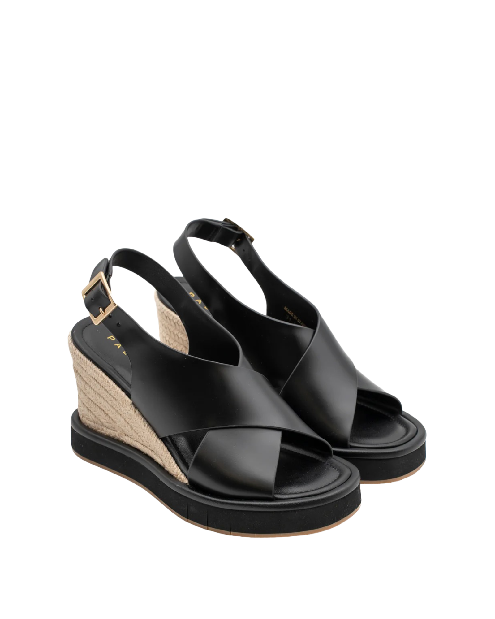 • 100% leather sandal with natural-colored jute-wrapped wedge, flexible micro sole, and metal buckle