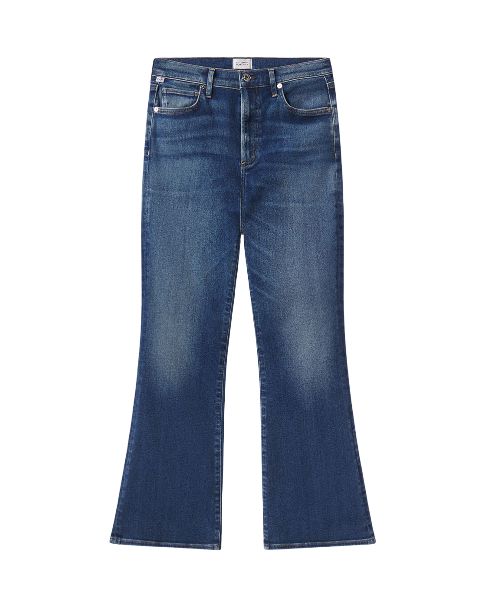 Designed to elongate the legs, this fit is flatteringly slim through the thighs before kicking out to flared hems.