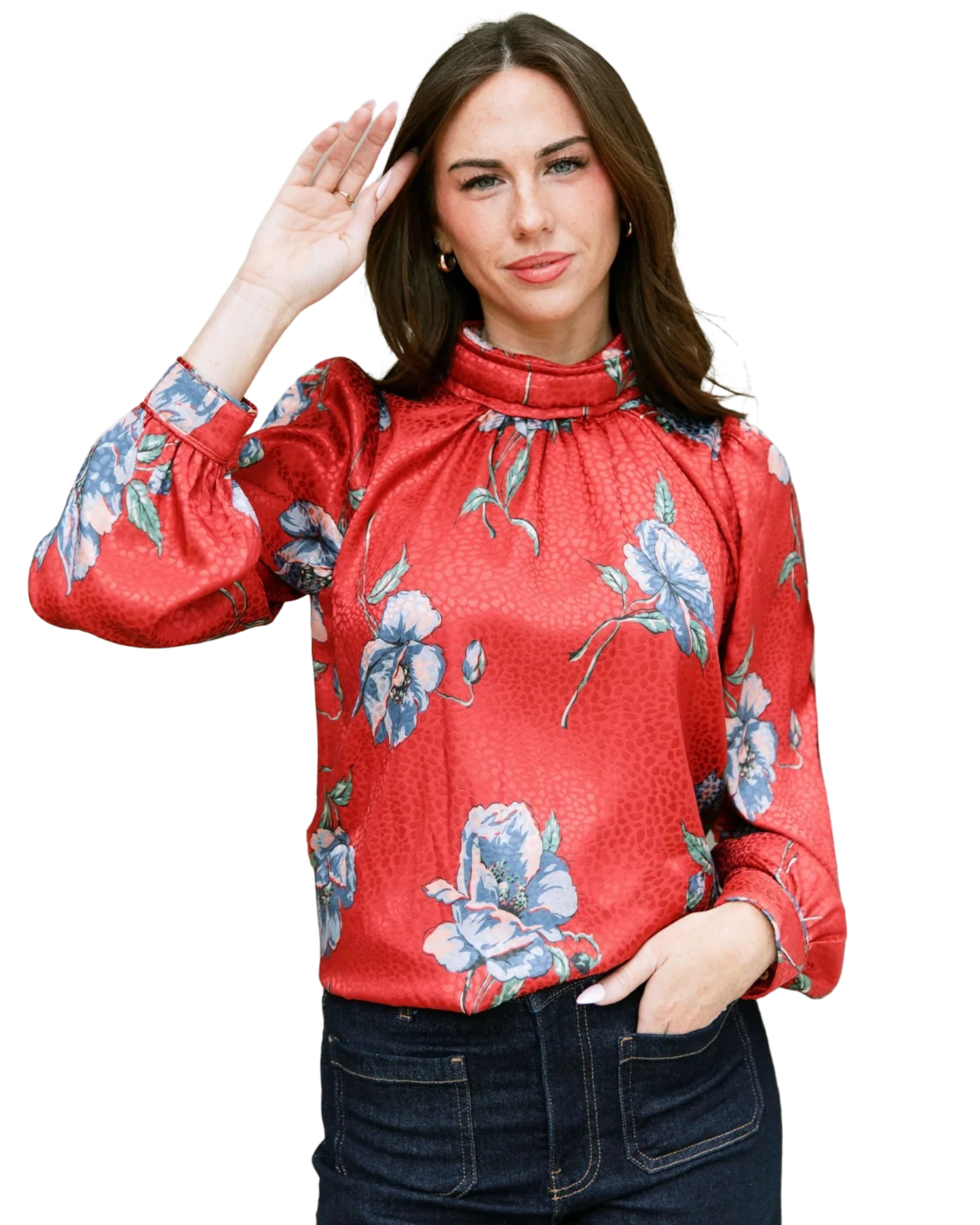 • High neckline with pleating