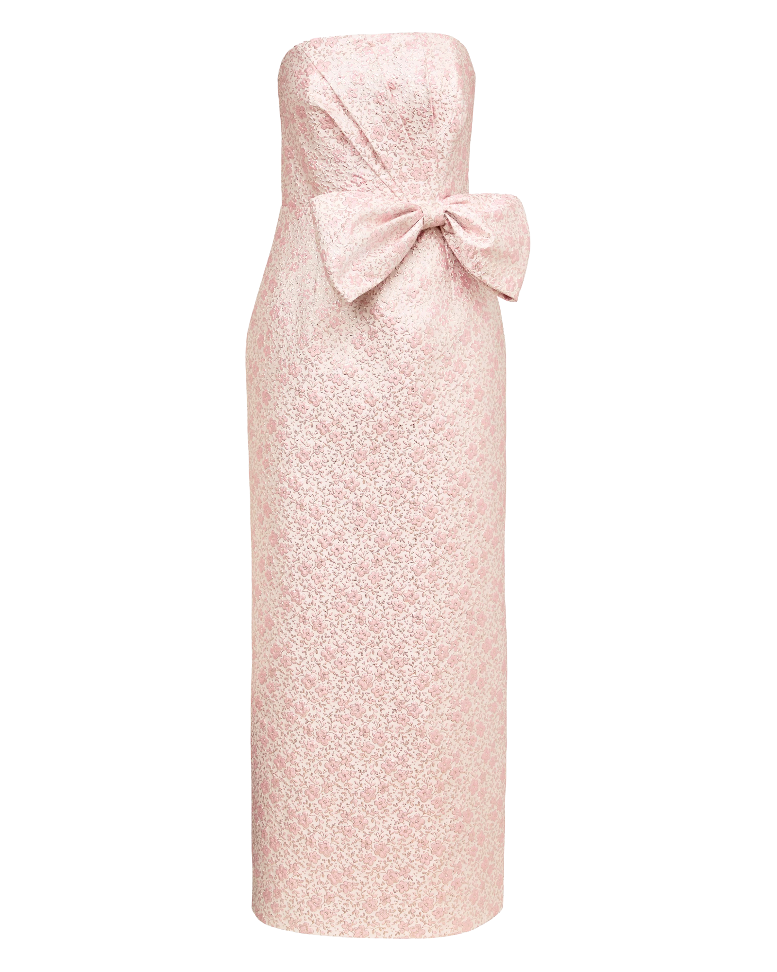 • Fitted, strapless maxi dress with a pleated bodice, interior corset, and bow detail at the waist