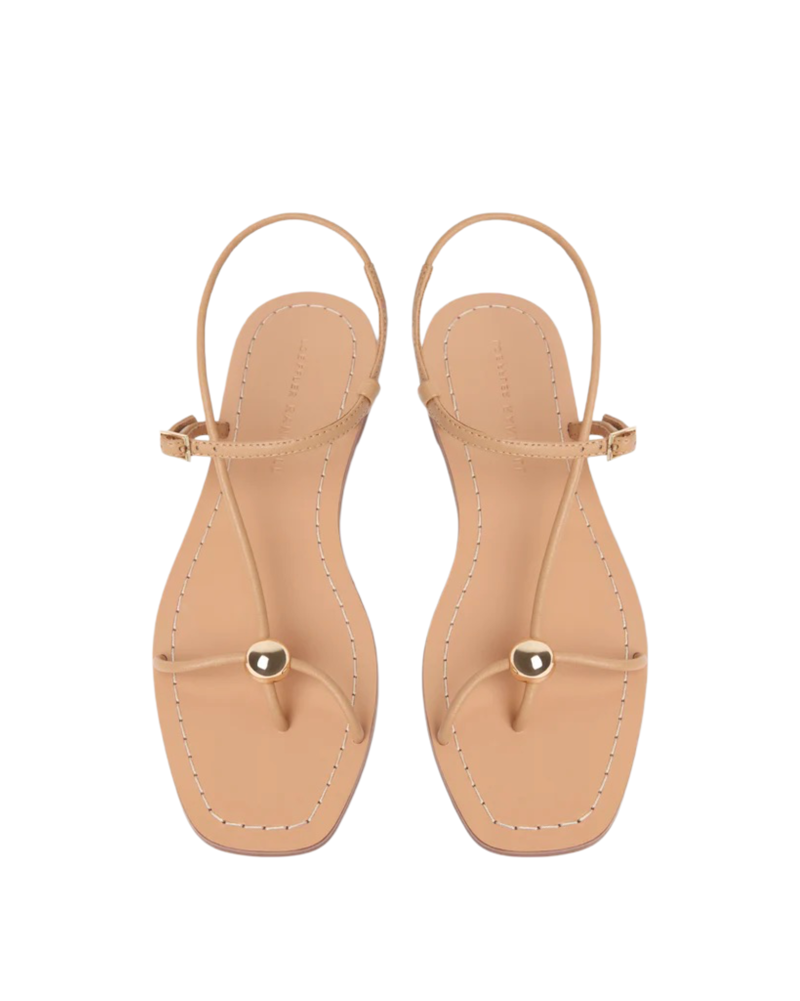 • Features a plank footbed, an open toe, and an intricate strap design with buckle closure and gold ball detail
