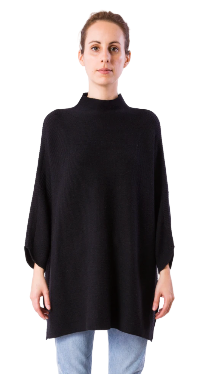 Turtleneck 3/4 sleeve tunic in garter stitch with side slits and contrasting rib accents.