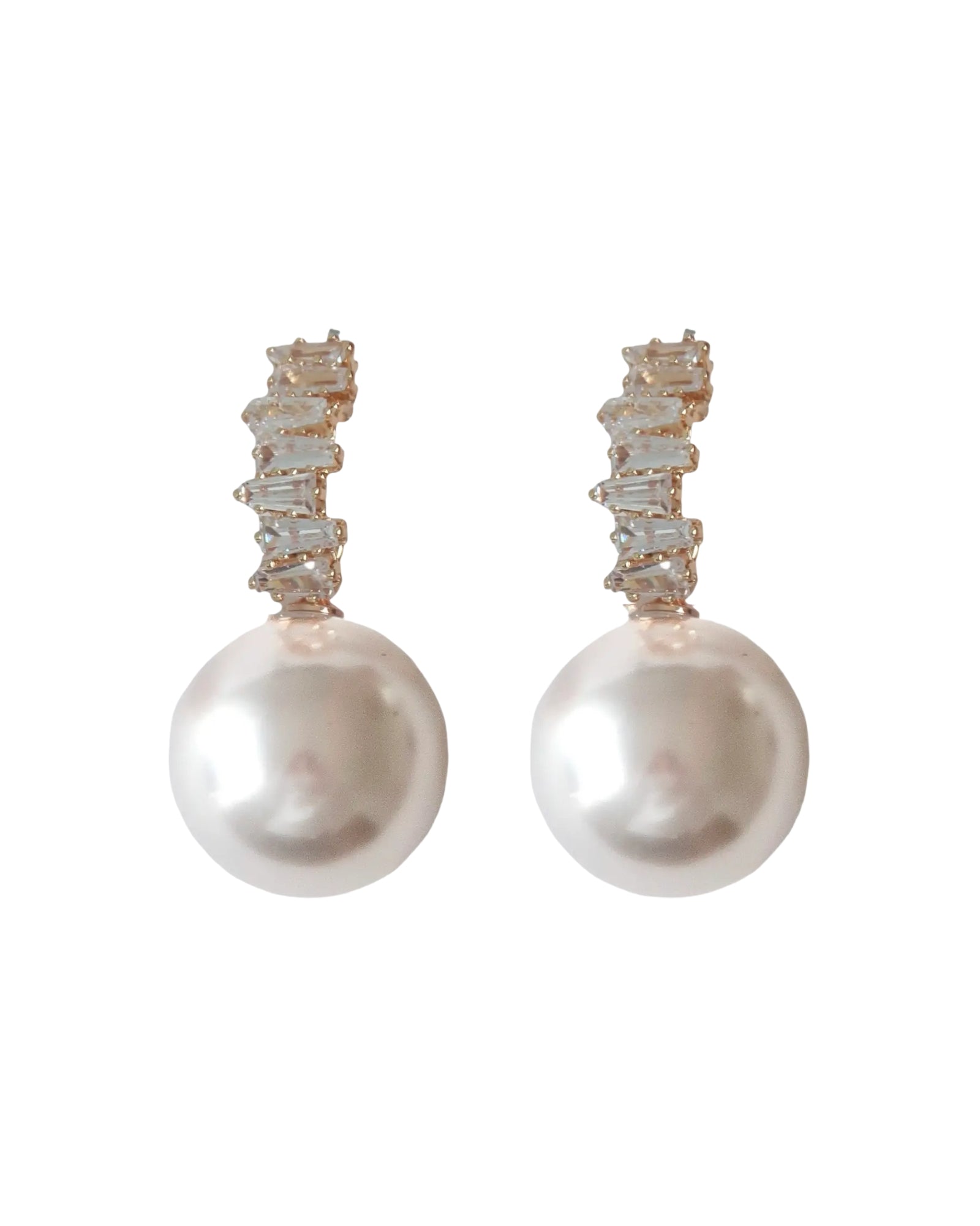 Elegant yet modern, these earrings feature a luminous faux pearl drop suspended from a vertical row of sparkling baguette-cut crystals. At 1” in length, the silhouette is refined and festive
