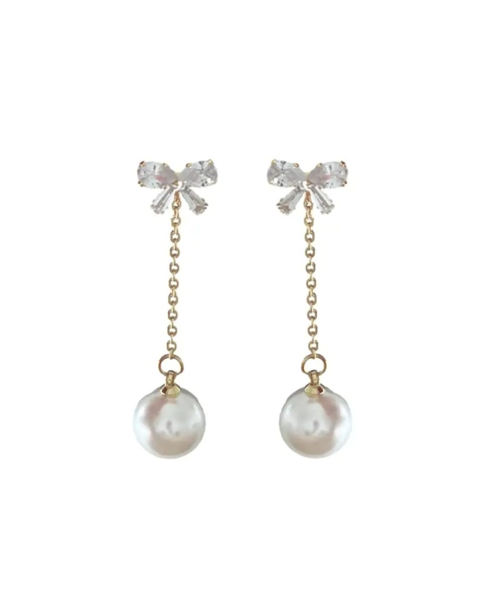 Sweet, sparkling, and perfect for the holidays—these earrings feature a delicate crystal bow stud paired with a dainty chain and faux pearl drop.