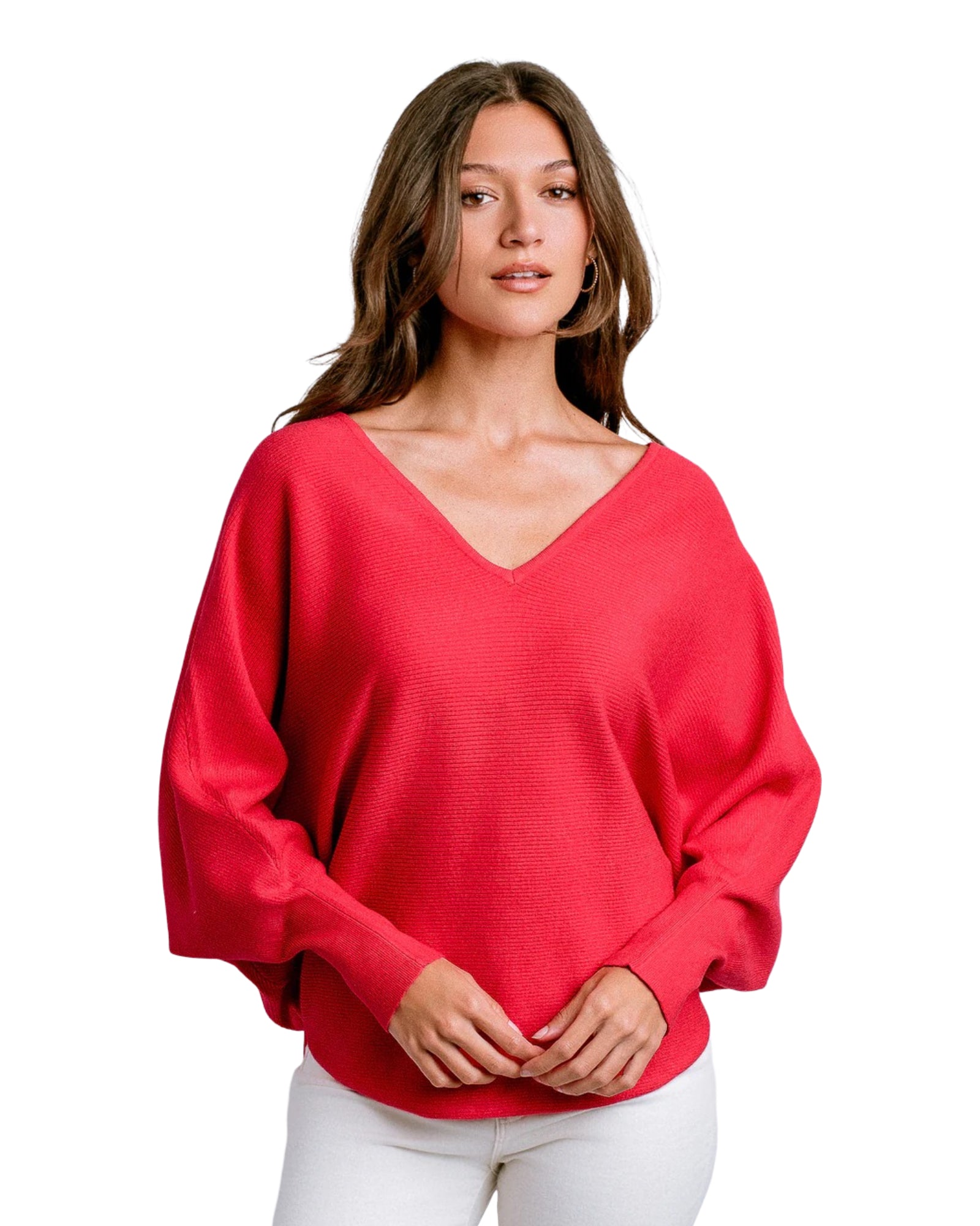 Everybody's favorite sweater now with a v-neckline! Oversized V-neck top w/ 3/4 length dolman sleeves.
